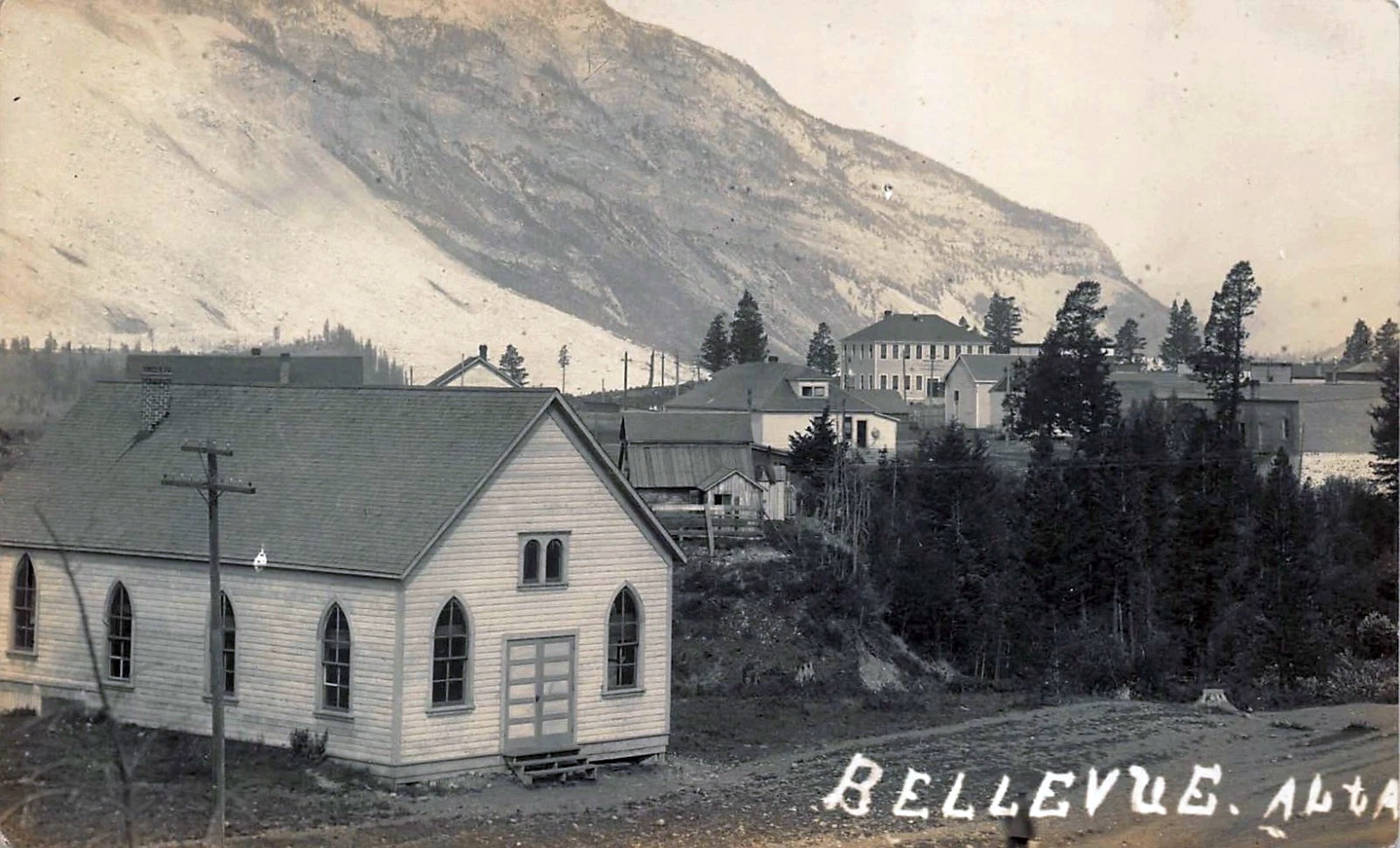 The naming of the town is credited to Elsie Fleutot, the young daughter of one of West Canadian Colieriies French Canadian principals, Jules J. Fleutot, after she exclaimed "Quelle belle vue!"